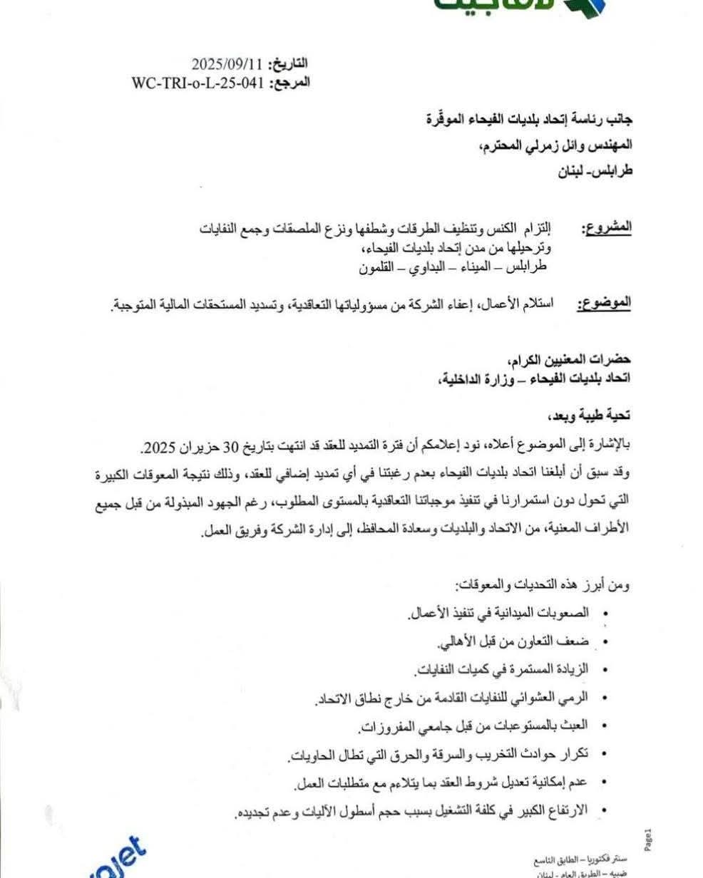 بالإشارة إلى العقد المبرم بين شركتنا واتحاد بلديات الفيحاء والمتعلق بأعمال الكنس والتنظيف وجمع وترحيل النفايات، نود إعلامكم بما يلي: