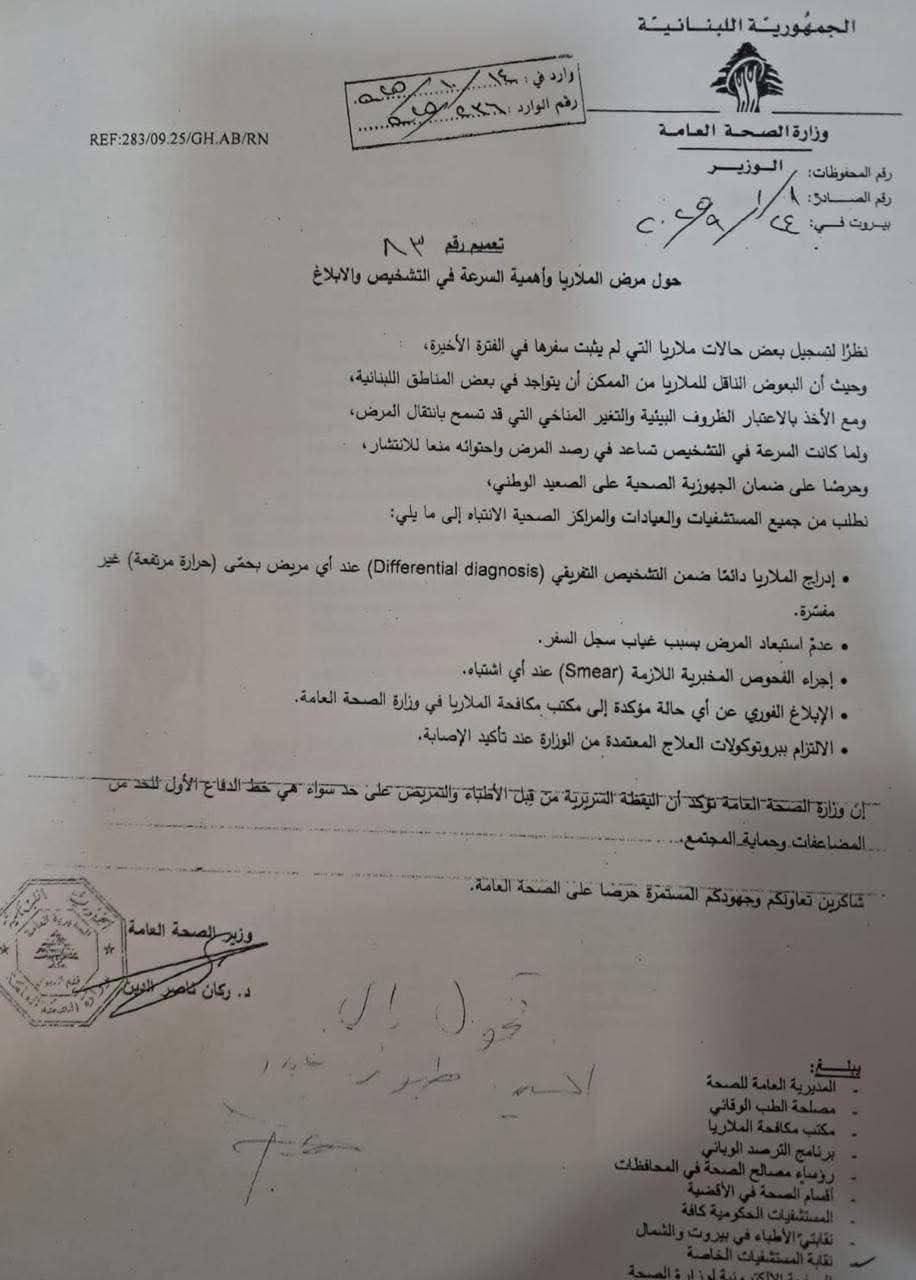دقت وزارة الصحة اللبنانية ناقوس الخطر وأصدرت تعميماً حول مرض الملاريا وأهمية السرعة في التشخيص والإبلاغ.