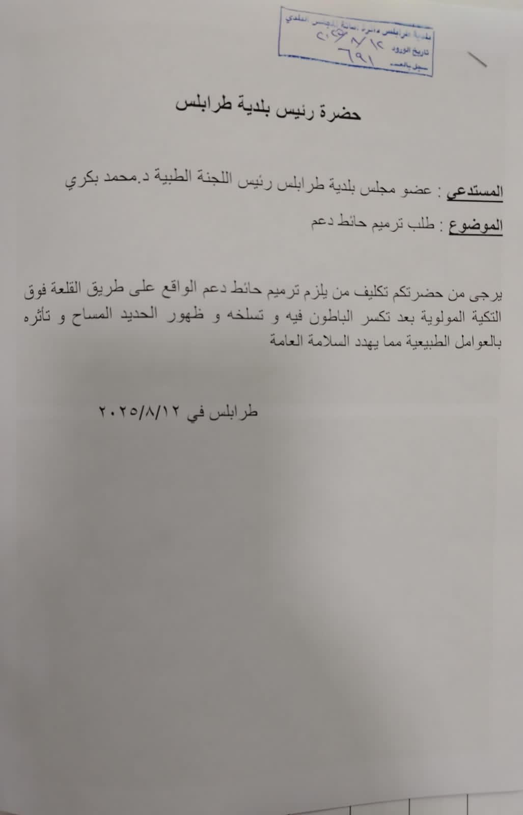 عضو بلدية طرابلس الدكتور محمد البكري كان قد تقدّم بتاريخ 12-8-2025 بكتاب رسمي إلى رئيس البلدية، حذّر فيه من الوضع الخطير لحائط الدعم الواقع على الطريق الممتدة من القلعة باتجاه طريق القبة فوق التكية المولوية. وطالب بإبلاغ وزارة الأشغال العامة بضرورة التدخل العاجل لمعالجة التصدعات والتشققات التي قد تنذر بانهيار كارثي.