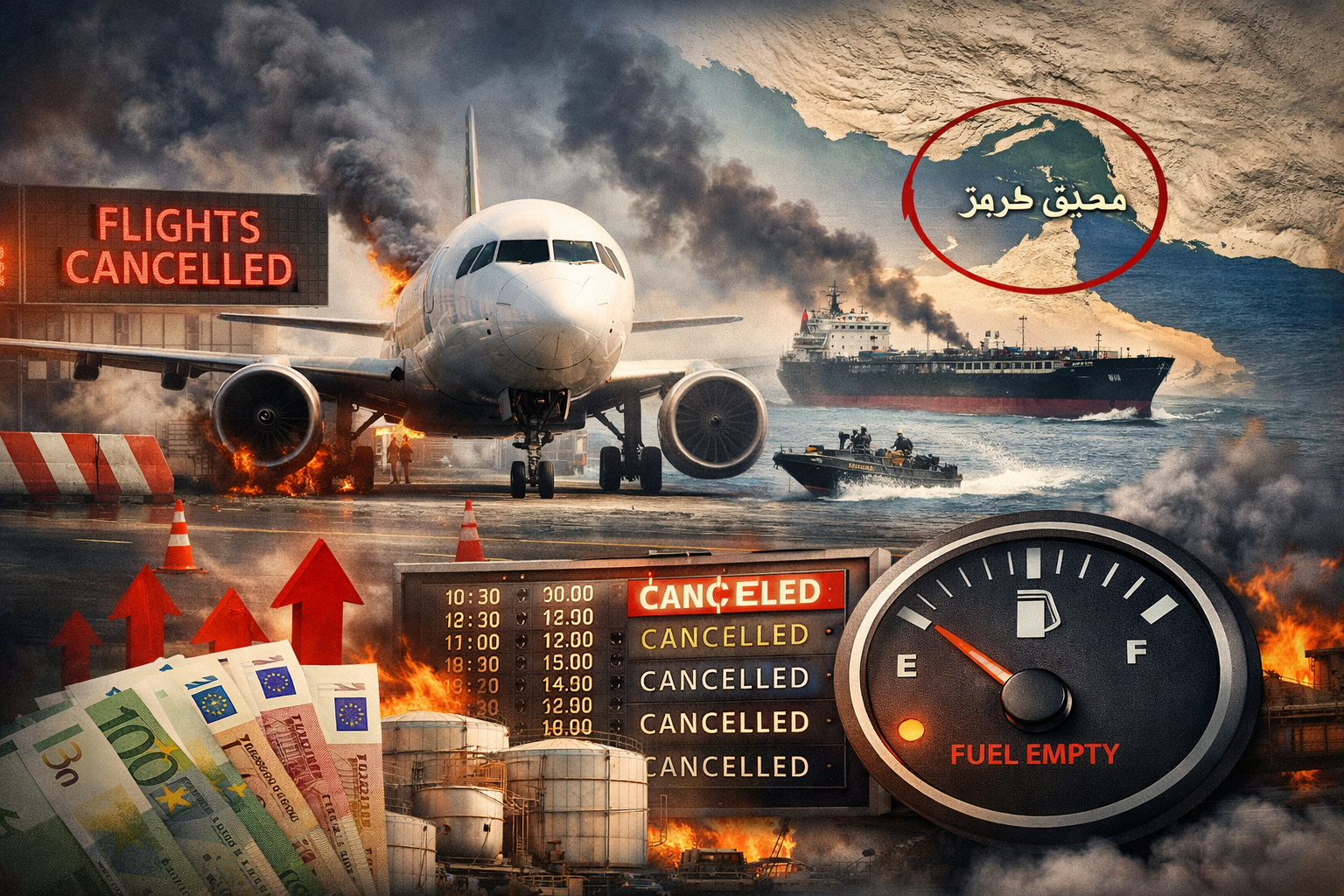 "أوروبا على حافة شلل جوي شامل بسبب نقص وقود الطائرات نتيجة أزمة مضيق هرمز، وسط تحذيرات من تداعيات اقتصادية عالمية وارتفاع أسعار التذاكر."